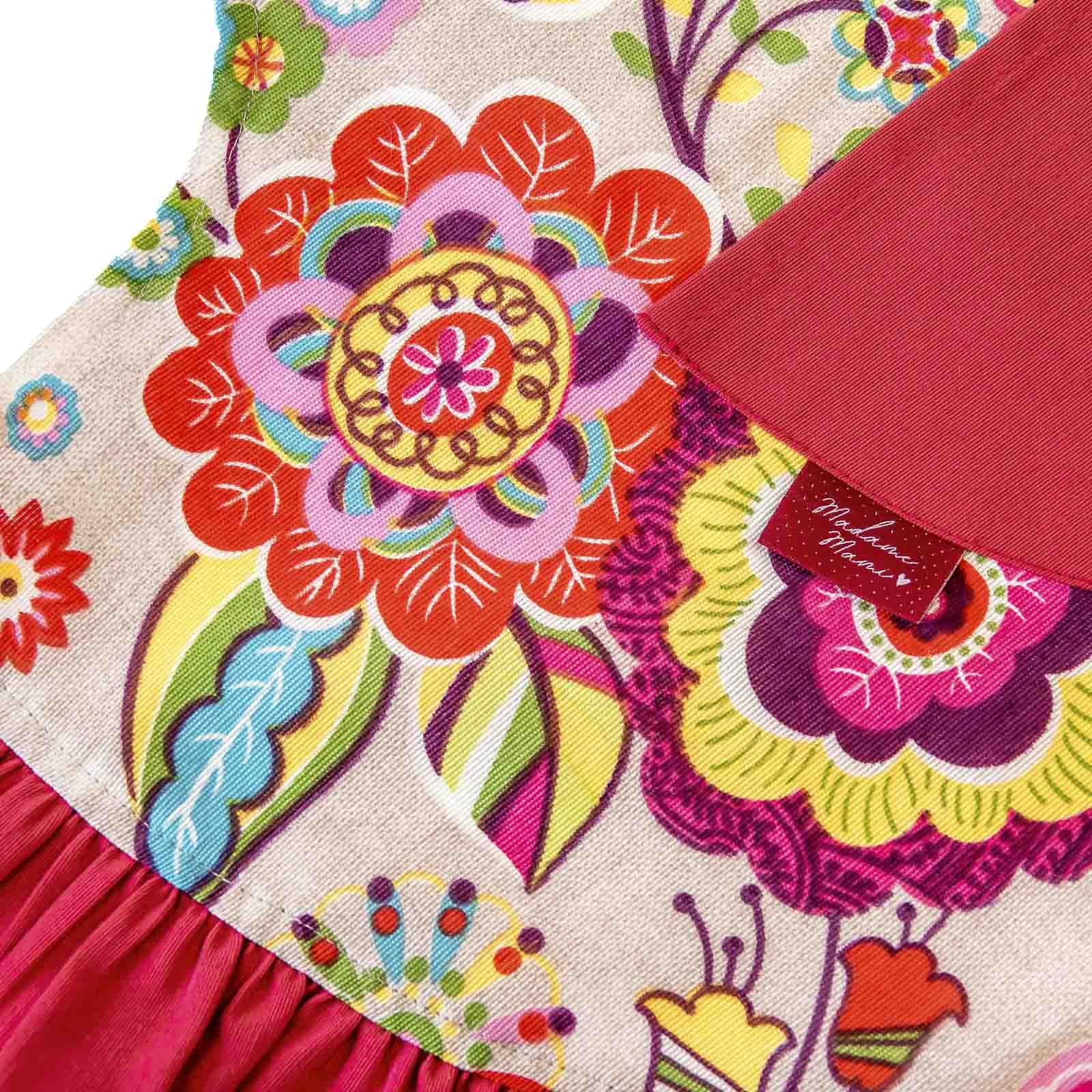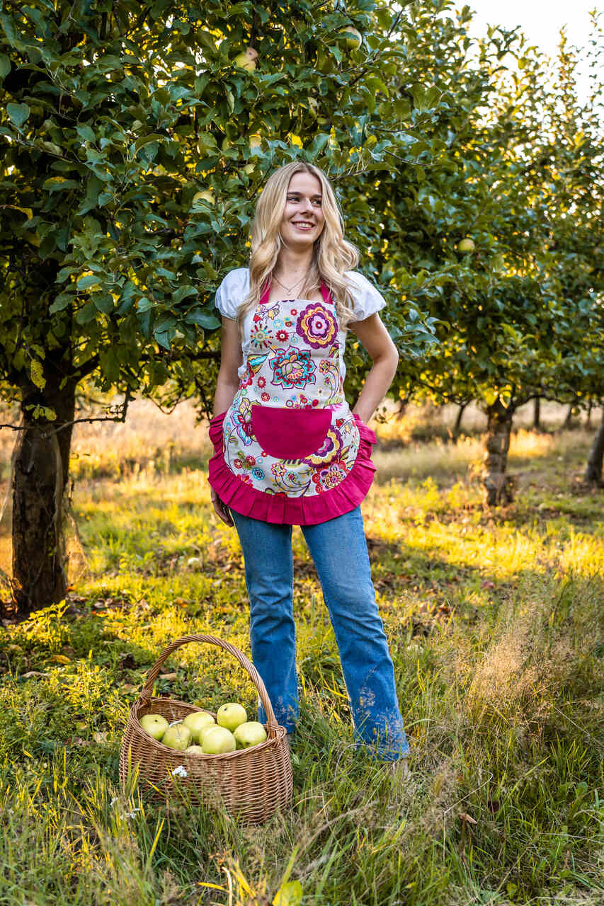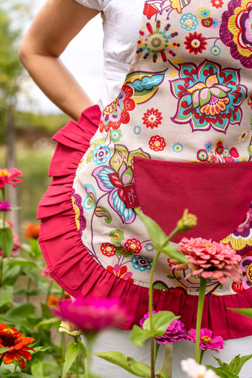 Fartuszek kuchenny „Zaczarowany Ogród” jest radosny, kolorowy i emanuje pozytywną energią. Zachwyci każdą kobietę, która lubi eksperymentować w kuchni! Ma ponadczasowy kobiecy krój, w którym każda kobieta bez względu na typ sylwetki będzie się dobrze czuć i wspaniale prezentować.